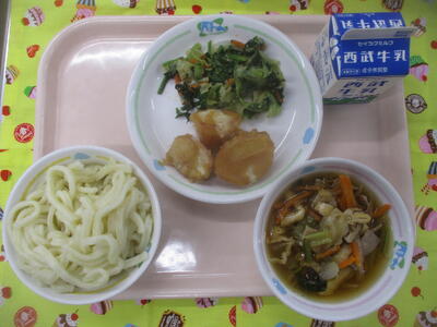 ~今日の献立~ 肉うどん 牛乳 みそポテト(2こ) ごまあえ
