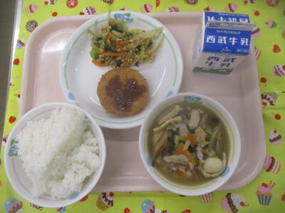 ~今日の献立~ ごはん 牛乳 さといもコロッケ なっとうあえ だんごじる