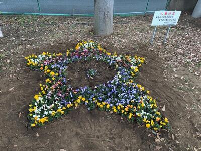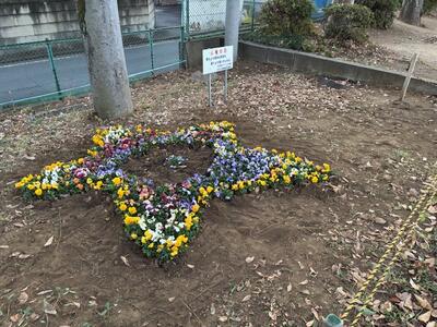 新所沢西地区青少年を守る会連合会より寄贈いただいたパンジーを園芸委員会の5・6年生が植えてくれました。園芸委員会の子たちの発案で今年は星形になっています。